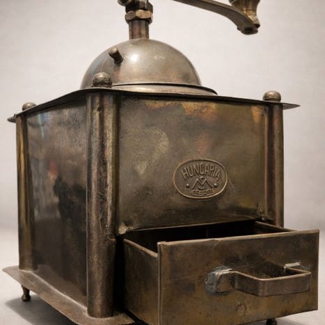 Fængslende vintage kaffekværn mærket BT – 'Ampia Garanzia', model 0, autentisk eksempel på italiensk mekanik fra begyndelsen af det tyvende århundrede.