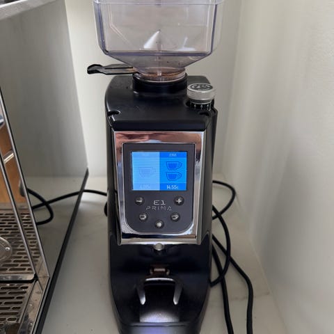 Victoria Arduino Venus espressomaskine, stor model, Venus family, fra 90'erne. Højde 50 cm. Beskrivelse af maskinen. Inkluderer 1 kaffefilterholder. Testresultater: Maskinen tændes. Modstanden varmer op. Vandpumpen fungerer. Den starter op. Laver støj, da den er tom for vand. Jeg har ikke prøvet at lave kaffe. En revision anbefales for kalkrensning. Som vist på billedet viser nogle messingdele tegn på tidens gang. Da det er en ret krævende maskine, både at sende og pakke, anbefales det at tænke sig godt om, før køb. Tak, Victoria Arduino Venus.