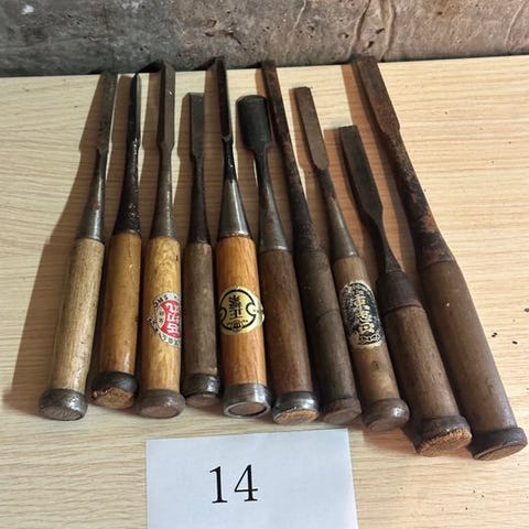 Dette lot (Lot #27) byder på en blandet samling af 6 japanske træmejsler (Nomi), der giver en balance mellem klar-til-brug moderne værktøjer og vintage stykker, der er perfekte til restaurationsentusiaster. Dette sæt er ideelt for træhåndværkere, der søger autentisk japansk stål til restaurering eller praktiske værktøjer til groft snedkerarbejde.