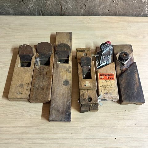 Denne part indeholder en kurateret samling af 5 vintage japanske træplaner (kanna), inklusive en premium-model fra det berømte mærke "Gisuke" (儀助). Japanske planer er verdensberømte for deres unikke "pull-stroke"-teknik og den fremragende kvalitet af deres laminerede stålsblad. Denne samling omfatter forskellige størrelser, fra standard glatplaner til mindre detaljeringsplaner, hvilket afspejler de sofistikerede behov i traditionelt japansk snedkeri. Disse er essentielle genstande for samlere af fint værktøj eller udøvere af traditionelt træarbejde.