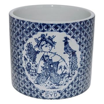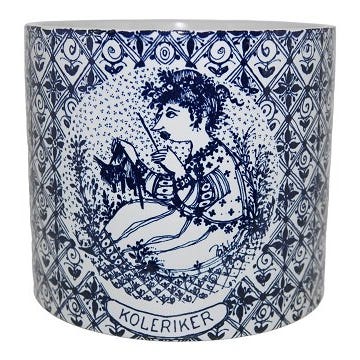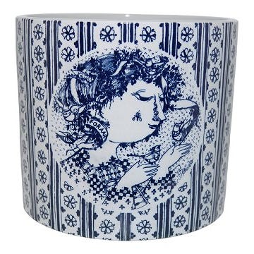 Urtepotteskjuler i porcelæn med motiv i sort streg af kvinde med titlen Sommer. Nr. 3024-699