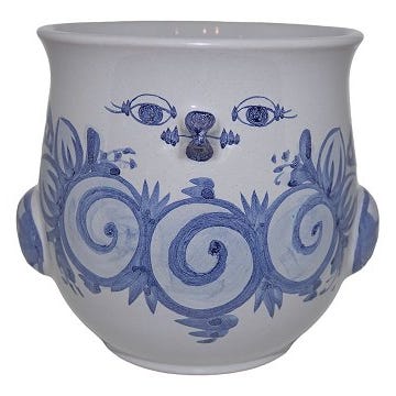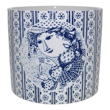 Urtepotteskjuler i porcelæn med motiv i sort streg af kvinde med titlen Vinter. Nr. 3024-699