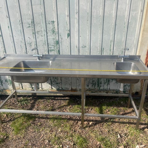 Rustfrit Stål dobbelt Køkkenvask ca 140x45 med afløb og blandingsbatteriet er på væggen.