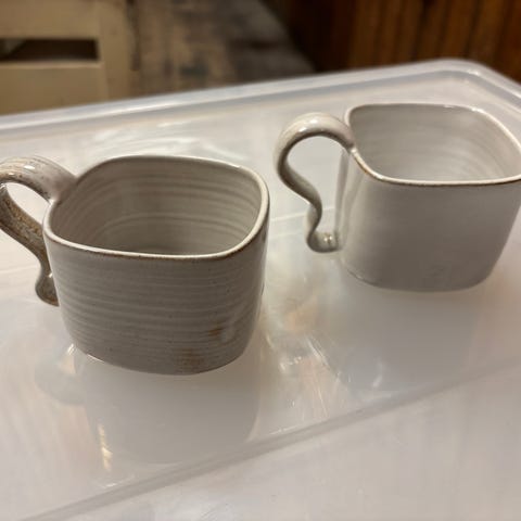 Kaffekopper med karakteristisk rund hank. Kan stables. Ukendt keramiker.