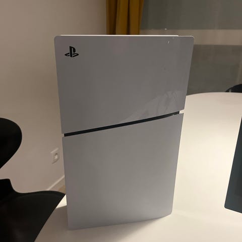 Sony Playstation 5 konsol i hvid farve. Stationær spillekonsol med tilhørende trådløs controller (DualSense).