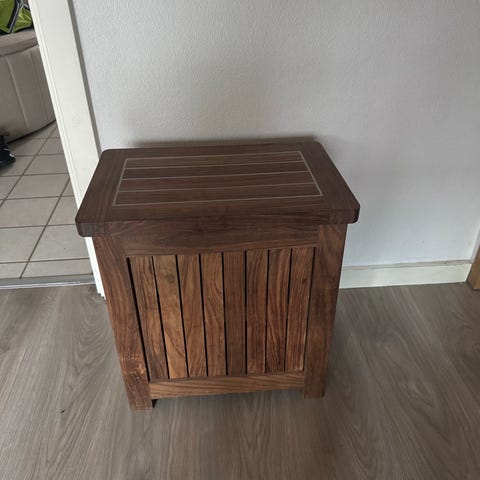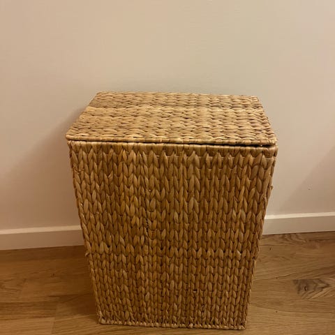 Vasketøjskurv med dobbelt rum i træ med naturfarvet finish. Kurven har gitterfront og top, der kan åbnes. Indvendigt er der to separate stofposer i lys farve, som kan tages ud via træhåndtag. Velegnet til sortering og opbevaring af vasketøj i fx badeværelse eller bryggers.