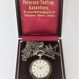Devina lommeur unisex med kvartsurværk. Uret har hvid urskive med arabertal, tre visere og datovisning. Urkassen er guldtonet med klaplåg og bagside med lille skjoldmotiv. Lommeuret har kæde, der kan fastgøres i bæltestrop eller lignende