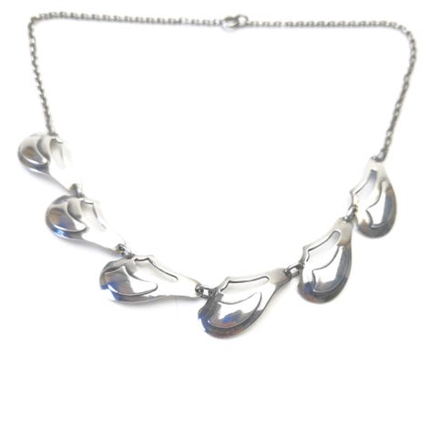 Elegant vintage halskæde i sterling sølv. Halskæden har en fin bismarck kæde og er dekoreret med små halve sølvkugler langs den nederste del. Den har en klassisk lås hvor der er stemplet 925. Den er formodentlig lavet af Hermann Siersbøl fra Kastrup. Halskæden måler 45 cm lukket og fremstår med almindelig brugs spor.