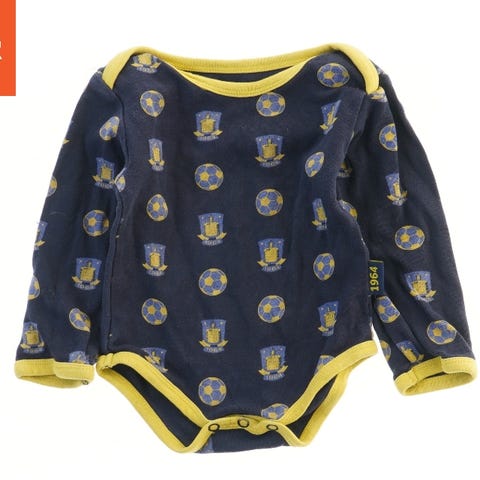 Langærmet bodystocking med gul kant i størrelse 74/80, dekoreret med fodbold og Brøndby IF logoer.