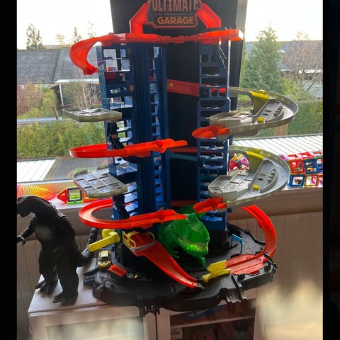Hot Wheels City Ultimate Garage racerbane med dragefigur og flere etager til leg med små metalbiler. Banen har spiralformede orange spor, elevator til bilerne og integreret parkeringsgarage. Velegnet til brug med standard Hot Wheels-biler i metal (1:64). Sættet er fremstillet i plast og er beregnet til indendørs leg for børn fra ca. 4 år og opefter.