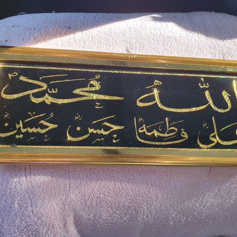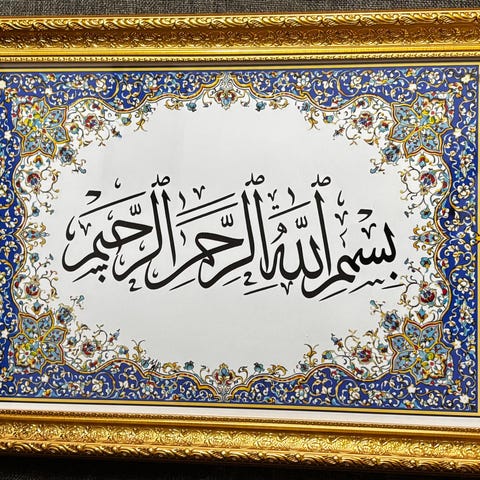 Vægdekoration med arabisk kalligrafi i guld på sort baggrund. Rektangulært design, egnet til ophæng på væg i f.eks. stue, gang eller kontor. Teksten er udført i dekorativ kalligrafisk stil med detaljerede linjer og ornamenter i hjørnerne.