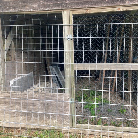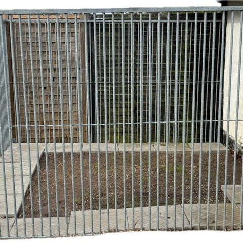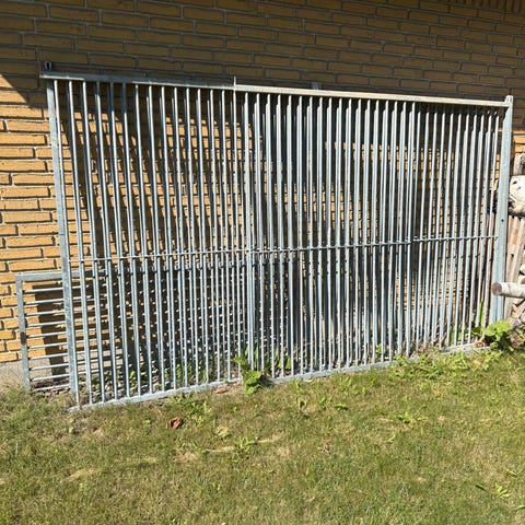 Lågesektion til kennel i varmgalvaniseret stål. Sektionen måler ca. 200 cm i bredde og 180 cm i højde. Afstanden mellem de lodrette rør er ca. 5 cm.