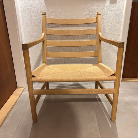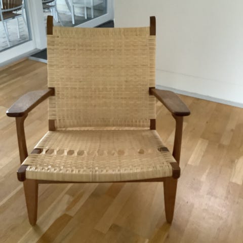 Rigtig flot CH44 i sæbebehandlet eg. Stolen har for nylig fået nyt sæde i papirgarn og fremstår i rigtig fin stand. Helt fast i alle samlingerne.