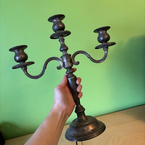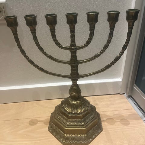 Mener det hedder en menorah stage... Og det ligner at den er lavet i messing eller bronze. Armene er bevægelige, og stagen kan skilles ad. Jeg havde den selv skilt ad for et par år siden, Og pudsede den helt op igen.