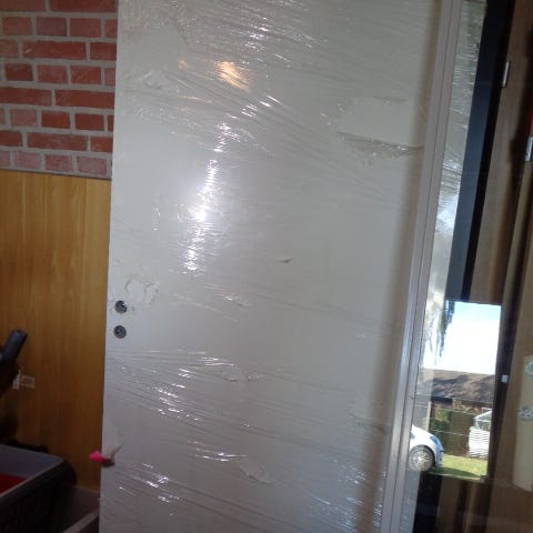 Dør med karm i hvid overflade. Karmen er i træ, som vist på billederne. Velegnet som almindelig hoveddør til opgang eller lignende.