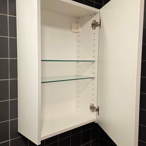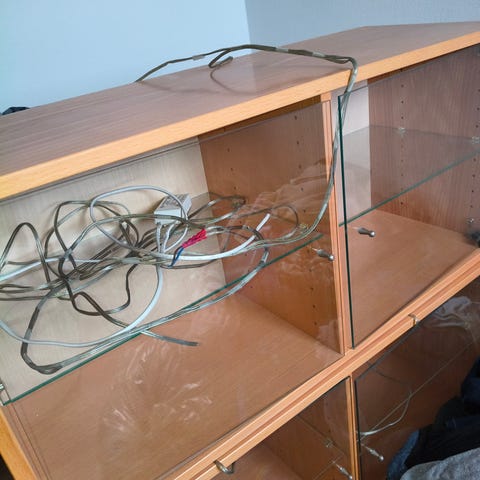 • Antal: 3 skabe med glaslåger + 1 lang hylde.