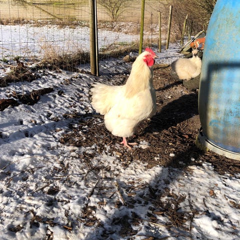 Hane i hvid farve med sorte fjer omkring halsen Hvid Sussex race , fra Juli 2025.Velegnet som fjerkræ til have- eller hobbyhold. Befrugter pænt alle eg. Gives gratis på grund af gener til nabo , afhentning hurtigst muligt.