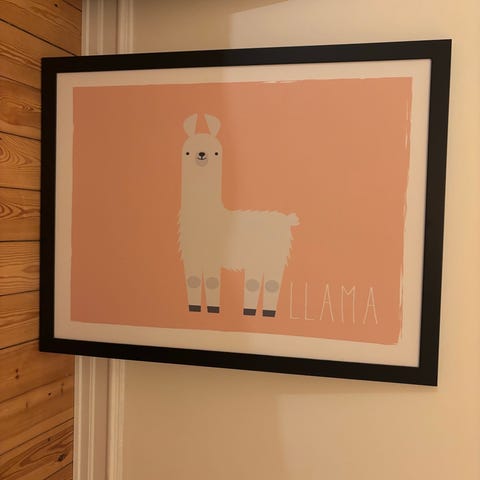 Plakat med motiv af en lama, der bærer solbriller og puster en tyggegummiboble. Baggrunden er pink, og farverne er holdt i lyserøde og hvide nuancer. Plakaten måler 100x140 cm og egner sig som vægdekoration, f.eks. på børneværelse eller i opholdsrum. Leveres som plakat uden ramme. Sælges grundet fejlkøb fra min side