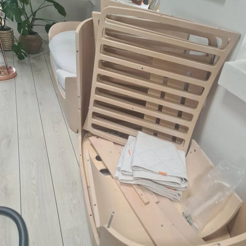 Leander tremmeseng i hvid. Klassisk oval tremmeseng med justerbar bund og aftagelige endestykker, så sengen kan tilpasses barnets alder. Medfølgende dele som vist på billederne, herunder sengebund og side-/endestykker. Velegnet som babyseng og juniorseng afhængigt af opsætning. Farve og form fremgår af billederne, ligesom eventuel brugsslitage kan ses der.