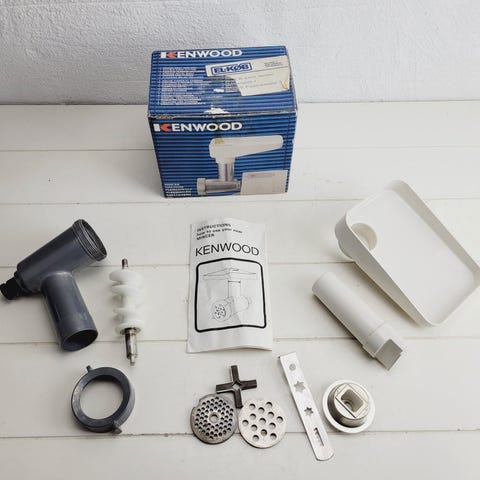 Kenwood Chef/ Chef XL/ kMix kødhakker-tilbehør. Tilbehør til Kenwood røremaskiner, der fungerer som kødhakker. Enheden monteres på fronten af maskinen og bruges til at hakke kød og andre egnede råvarer. Sættet indeholder kødhakkerhus, påfyldningstragt og tilhørende dele som vist på billederne. Velegnet til brug med Kenwood Chef, Chef XL og kMix serierne, ifølge emballagens angivelse.