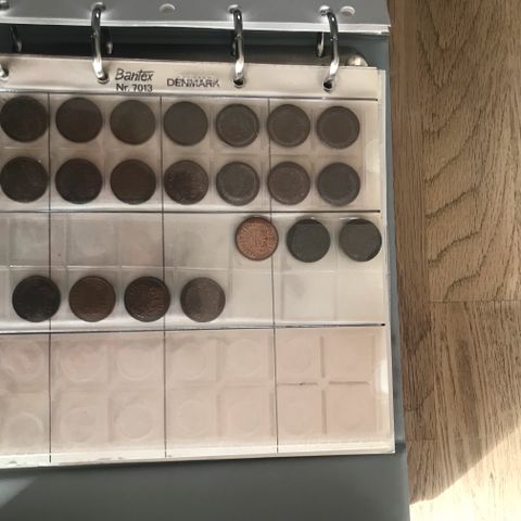 Samling af mønter og sedler. Mest danske mønter. Mange kobbermønter. Sedler fra flere steder i verden.