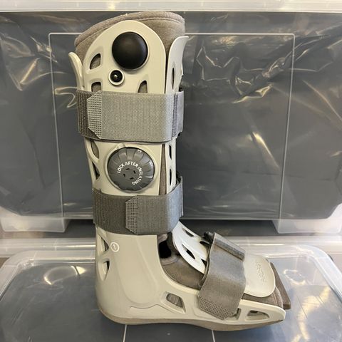 Aircast Walker støvle i grå farve. Støvlen er en ortopædisk gangstøvle med hård ydre skal og blød polstring indvendigt. Den har flere justerbare velcrostropper for individuel tilpasning omkring fod og underben. Egnet til immobilisering og støtte af ankel og fod efter skade eller operation, hvor der er behov for kontrolleret belastning under gang.