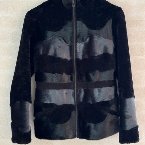 Royal Greenland frakke i pels til dame. Modellen er medium og har en multifarvet, mørk pelsoverflade. Frakken har hætte, knaplukning foran og brede opslag ved ærmerne. Indersiden er foret for øget komfort. Velegnet som yderbeklædning i blæsende og koldt vejr.