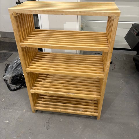 Reol i brun træ med flere åbne hylder. Reolen har lamelhylder og en smal, høj konstruktion, som gør den velegnet til opbevaring i mindre rum som badeværelse, entré eller stue. Åben konstruktion giver god ventilation omkring de ting, der placeres på hylderne.