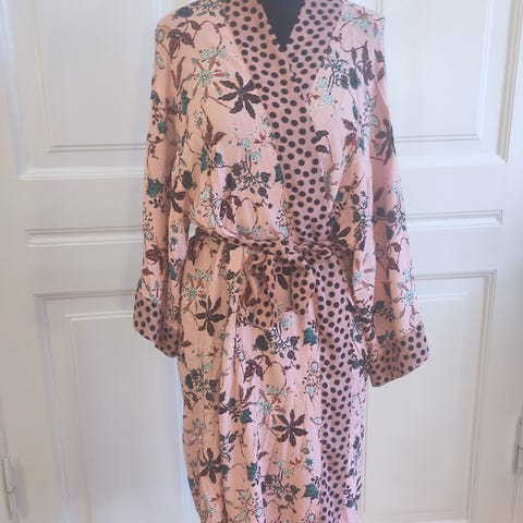 Sælger den lækreste rød/hvid stribede kimono / wrap kjole med bindebælte. Den falder virkelig flot og er super behagelig at have på – let, blød og luftig i stoffet (100% viscose). Brugt ganske få gange og fremstår næsten som ny. Sælges kun fordi jeg ikke får den brugt.