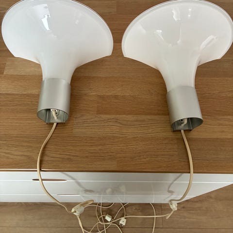 2 væglamper fra Holmegaard - “Mandarin” af Michael Bang. Kan både lyse op og ned. Bredde 28 cm og højde 22 cm - begge i fin stand, naturligvis medfølgende vægbeslag ! Pris for parret 1400 kr.