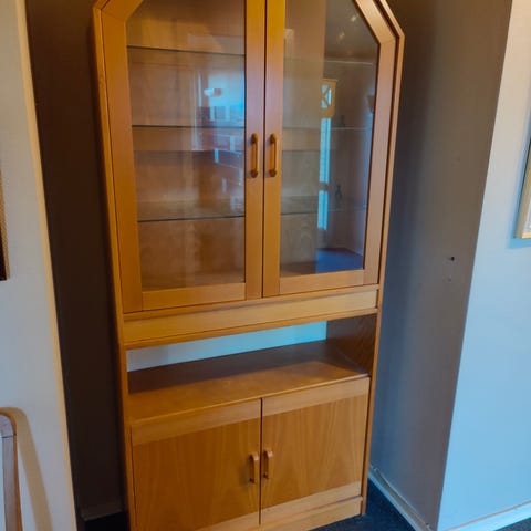 Systemet kan hænges på væggen (både under- og overdel). Der er lys i glasskabene.