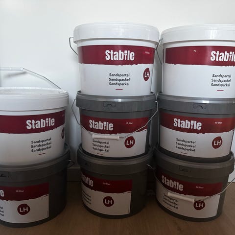 Den er let, flot færdig sandspartelmasse, anvendes indendørs rum loft og vægge,