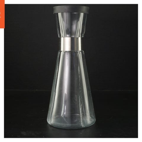 Denne genstand er en rund glas karaffel, der måler 22 cm i højden. Den har et klart glasdesign med et håndtag og et forseglet låg. Karaffelen har en rund bund og et bredt krop, der snævrer ind mod det øverste hvor låget sidder fast.