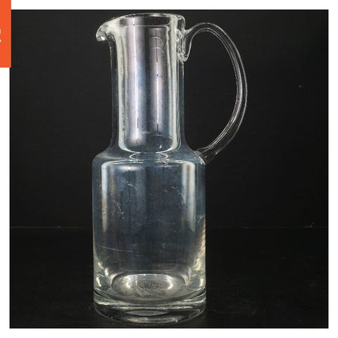 Dette er en glaskande med et håndtag og et blå plastlåg. Den har en kapacitet på cirka 15 cm, ideel til servering af drikkevarer som vand, saftevand eller juice. Kanden har et kvadratisk formet design og er gennemsigtig, hvilket gør det let at se indholdet. Det blå låg er designet til at forhindre spild og sikre en tæt lukning.