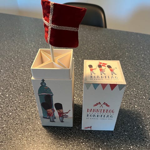 Dette er et Dannebrog bordflag fra Maileg, som fremstår i en stilfuld og klassisk udformning. Flaget er monteret på en hvid stang med en rund fod, som giver stabilitet. Flaget er lavet af stof og har det karakteristiske røde og hvide design. Den medfølgende æske har illustrationer af det danske flag samt historisk inspiration. Størrelsen på flaget og stangen er 25 cm. Stand: aldrig brugt/som ny.