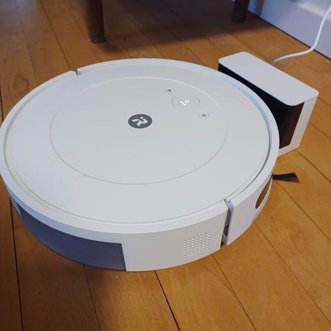 iRobot robotstøvsuger - gulvmoppe i hvid farve. Enheden er rund og lav, egnet til støvsugning af gulve og tæpper. Robotstøvsugeren kan styres via app på smartphone, hvor man blandt andet kan se status på filter, børster og øvrige sliddele. Velegnet til automatisk rengøring i hjemmet på daglig basis. Efter rengøring kommer den alene tilbage til oplader.