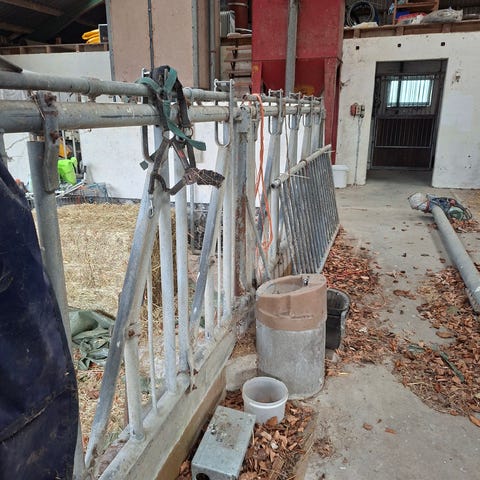 Staldinventar til kvæg. Har bl.a. fanggitter, delevægge, drikkekar, foderautomater og fodervogn. Foruden tingende på billeder har jeg en masse småting liggende til kvæghold.