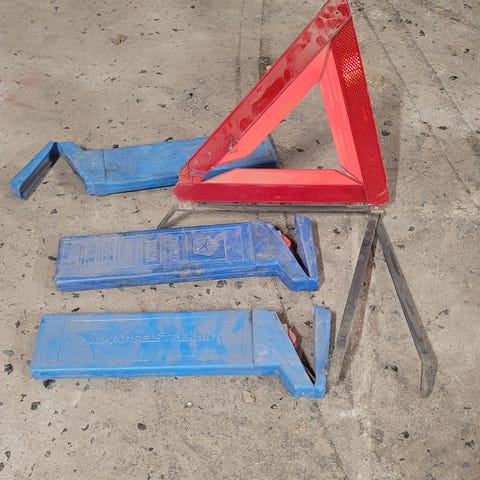 En rektangulær etui i plast, der indeholder en advarseltrekant. Den er designet til at blive anvendt i nødsituationer, hvor den placeres på vejen for at advare andre trafikanter. Etuiet har tekst og piktogrammer på forsiden, der illustrerer dets anvendelse.