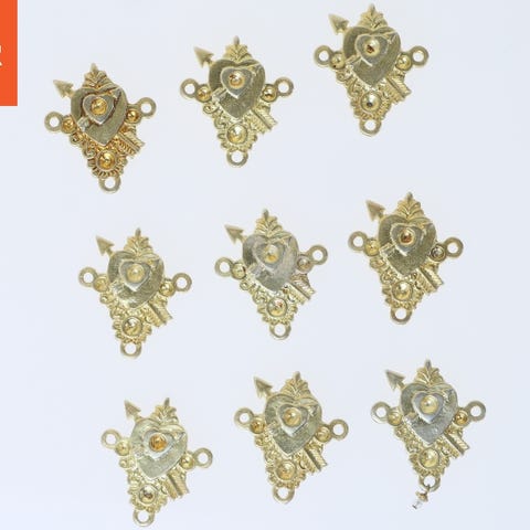 Sættet indeholder flere dekorative metalgenstande bestående af to fugle på en gren, to svampe, to kroner på pinde, en løs metalkrone, en fjer, og en lille firkantet æske. Alle dele er lavet af et glinsende metalmateriale. Det samlede indtryk er en samling dekorative pyntegenstande.