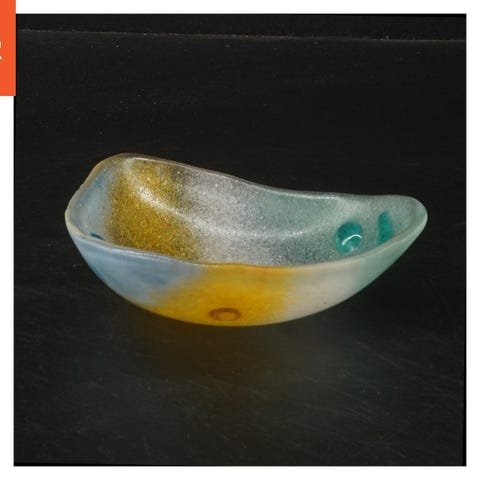 Et dekorativt fad lavet af glas. Fadet er 17x17x2 cm stort og har en blå farve med et kunstnerisk mønster i midten, herunder sorte linjer og prikker samt en cirkel, der giver det et unikt udseende. Det har en let kurvet form.