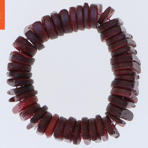 Et armbånd lavet af flere sammenhængende lyserøde og mørkerøde stykker i perlemor. Armbåndet har en diameter på cirka 16 cm, og det er samlet med to indvendige elastikbånd, der gør det fleksibelt at tage af og på.