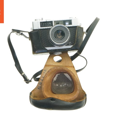 Dette er et vintage Agfa kamera, fremstillet i sort materiale med en kompakt firkantet form. Kameraet kommer med en brun lædertaske, som har synlige brugstegn og lukkemekanisme foran. Der er et bærehåndtag på toppen af kameraet og en drejeknap på siden. Kameraet er en ældre model og ser ud til at være i en brugbar stand.
