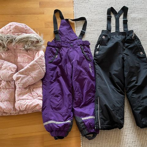 Et par lilla snebukser med et abstrakt mønster i lyserøde og mørkere lilla nuancer. Bukserne har en elastisk talje, knaplukning og forstærkninger på knæene og bunden af benene.