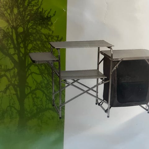 Sammenklappeligt campingkøkkenskab med opbevaring i grå tekstil og sort bordplade. Skabet har flere rum med lynlåslåger til opbevaring af køkkenudstyr, madvarer eller andet campingudstyr. Stel i metal giver stabilitet, og stoffet er fastgjort til rammen. Egnet til brug i fortelt, campingvogn eller som ekstra arbejds- og opbevaringsplads på ture. Kan klappes sammen for nem transport og opbevaring.