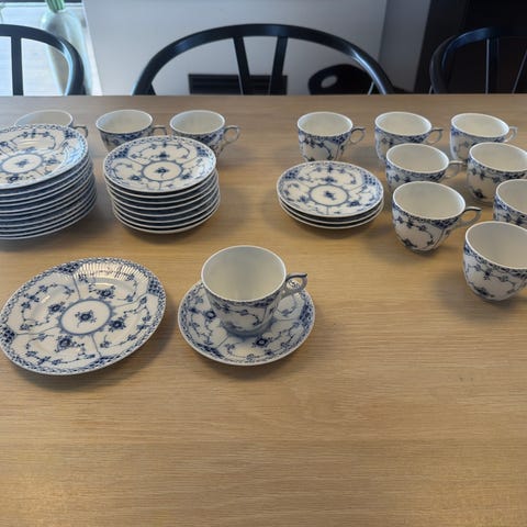 Royal Copenhagen stel i hvid porcelæn med blå dekoration. Sættet omfatter tallerkener i flere størrelser, dybe tallerkener, sukkerskål, flødekande samt kopper.