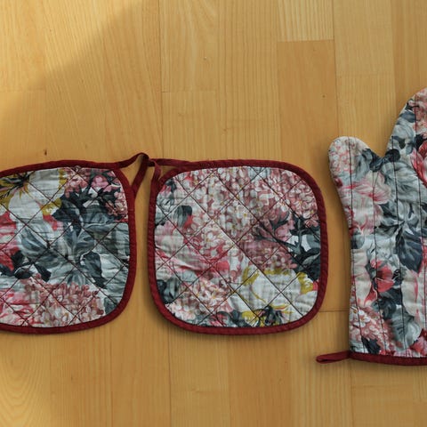 Disse grydelapper er fremstillet af silikone og har en lys rød farve. De afbildede grydelapper har et tredobbelte grip-design, som hjælper med at holde et fast greb når man håndterer varme genstande. De har en længde på 38 cm, hvilket giver en god beskyttelse af hånden. Mærket 'SK' er trykt på den sorte del af manchetten, som også har en loop funktion til ophængning.