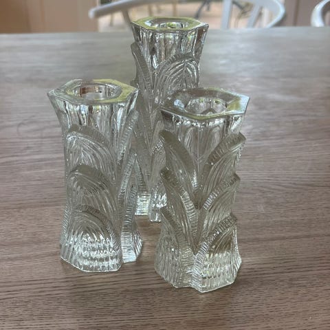 Glas, Lysestage, Orrefors sverige, Virkelig smuk stage til store lys på 4- 4,5 cm I diameter. Stagen er 6 cm høj og 11 cm I diameter. Kr 100
