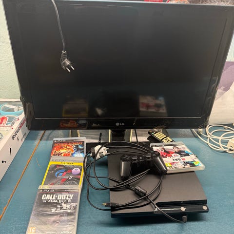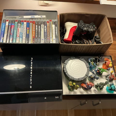 Xbox 360-konsol med tilhørende controller, strømforsyning og en samling Xbox 360-spil, men den oplyste konsoltype er Playstation 3. Sort