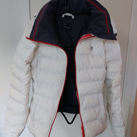 Amy grøn dunskijakke, str.44 damemode, figursyet, hætte til hjelm, snefang, mange lommer.