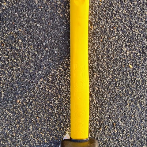Denne genstand er en ratlås designet til at forhindre biltyveri ved at blokere styringen af bilen. Den har en gul håndtag og en grå metaldel, der kan monteres på rattet. Ratlåsen kommer med en nøgle, hvilket gør den let at låse og oplåse. Størrelsen på låsen er 40 cm. Tags: ratlås, bilsikkerhed, biltyveri.